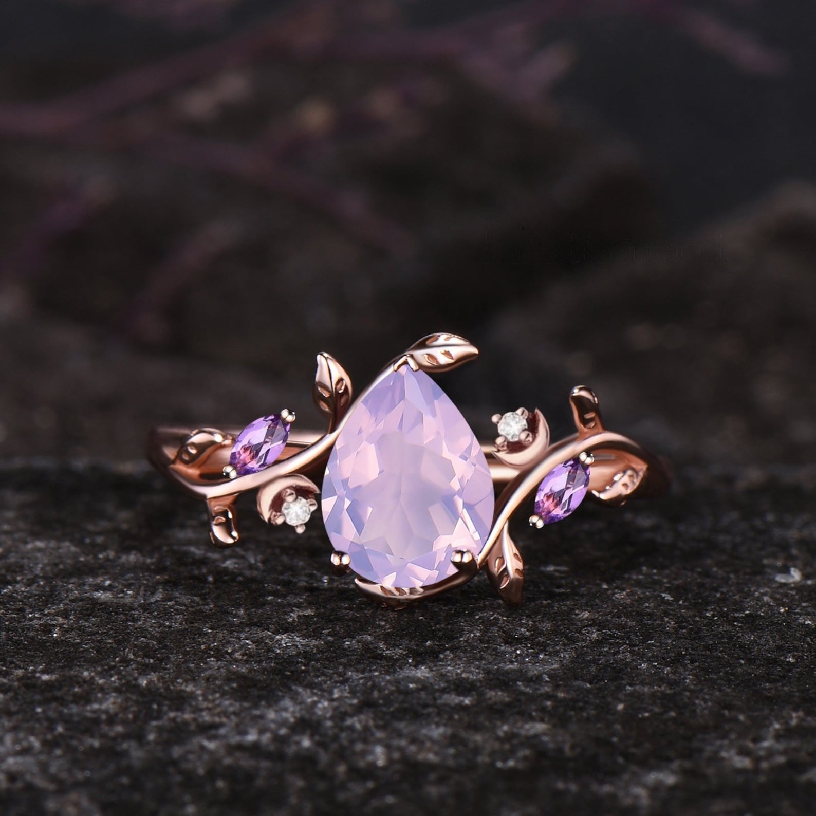 Teardrop Natural Lavender Amethyst Engagement Ring Set February Birthstone Amethyst Moon Ring Leaf Nature Inspired 2pcs Bridal Ring Set