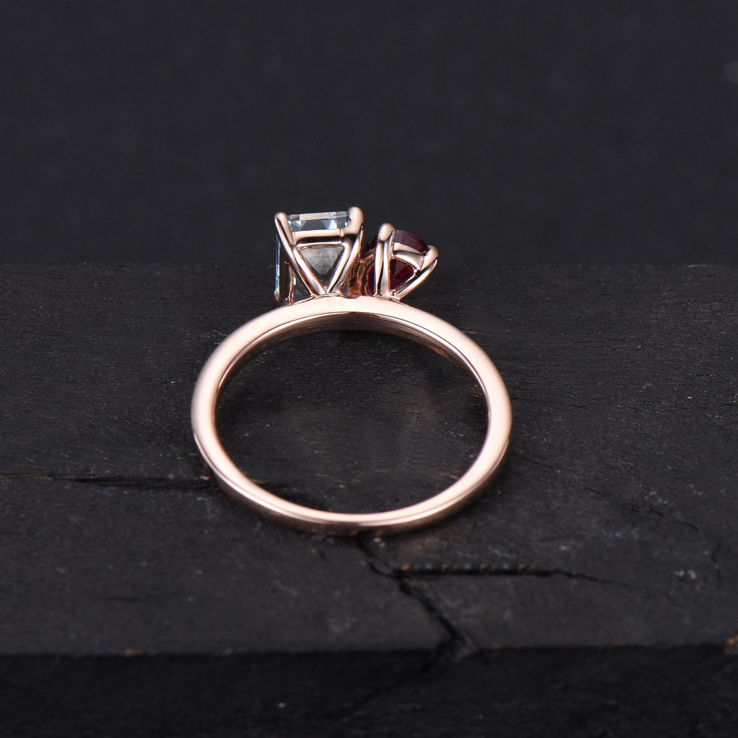 Toi Et Moi Ring,Pear and Emerald Cut Natural Aquamarine Ruby Ring,Two Stone Engagement Ring , 14k Solid Gold Aquamarine Wedding Promise Ring