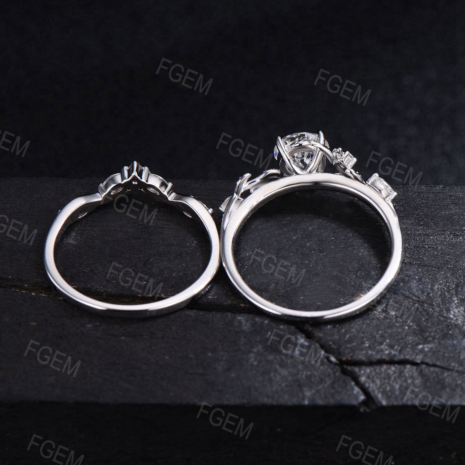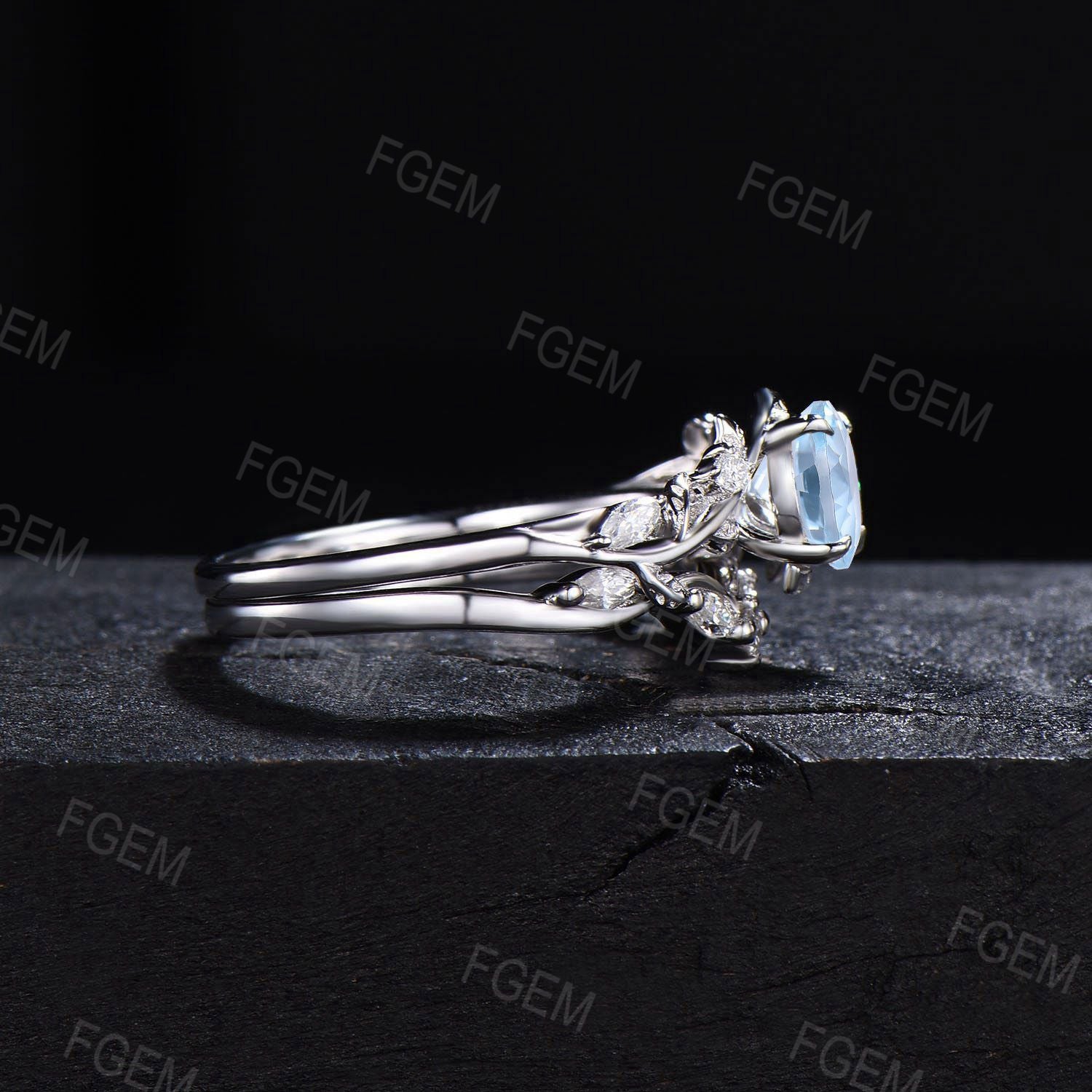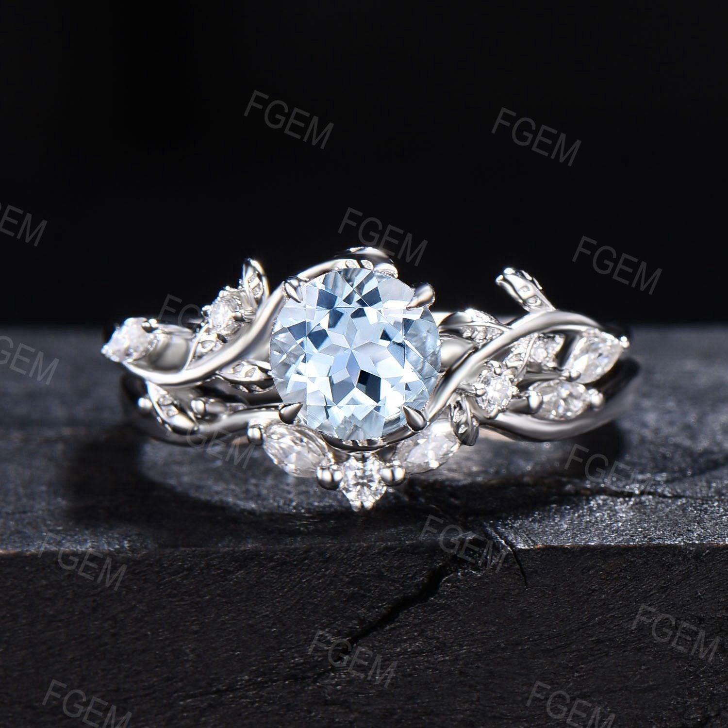 Twig Aquamarine Engagement Ring Set 6.5mm Round Natural Aquamarine Cluster Wedding Ring Branch Leaf Bridal Set March Birthstone Propose Ring