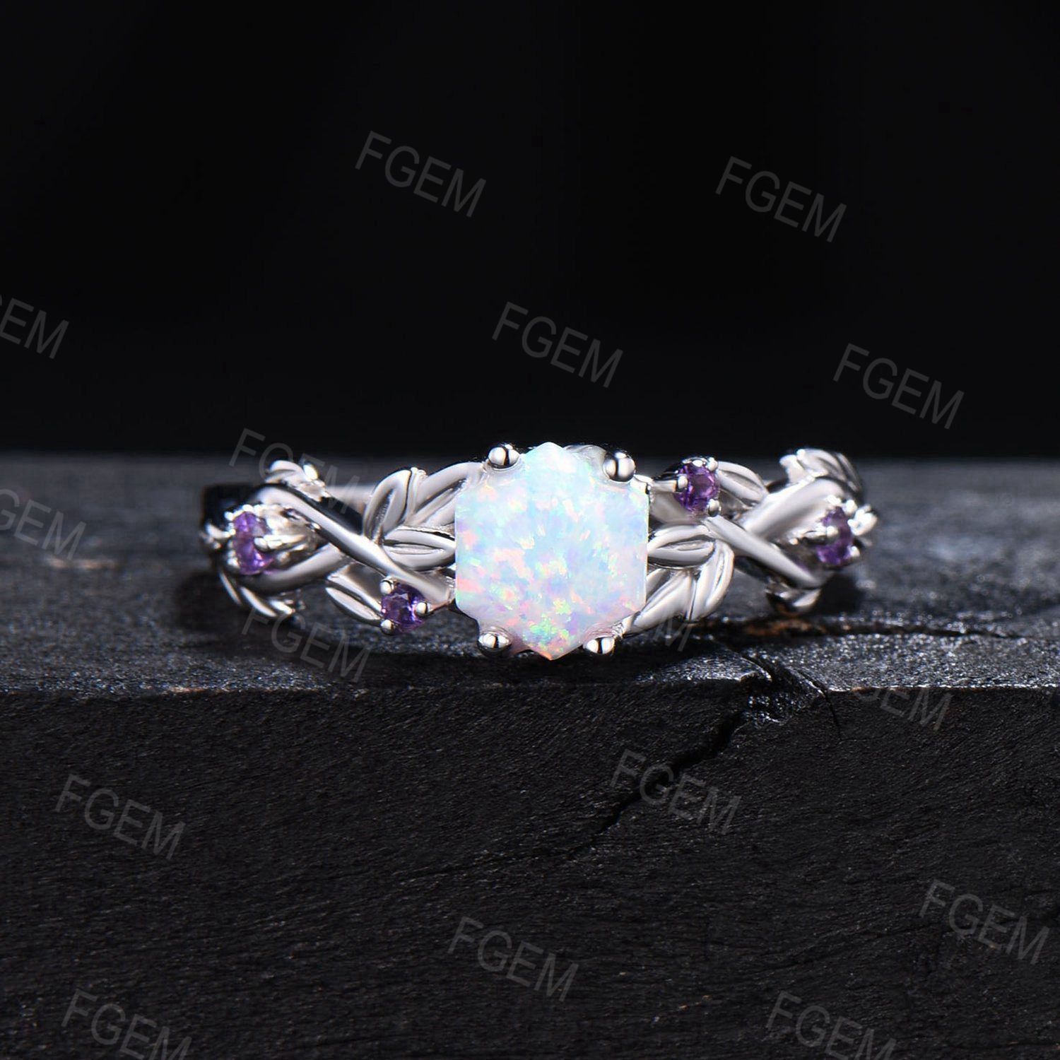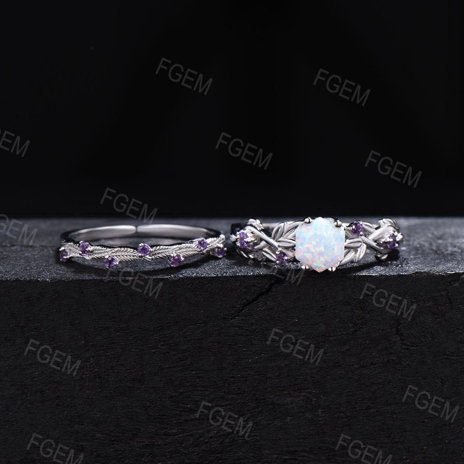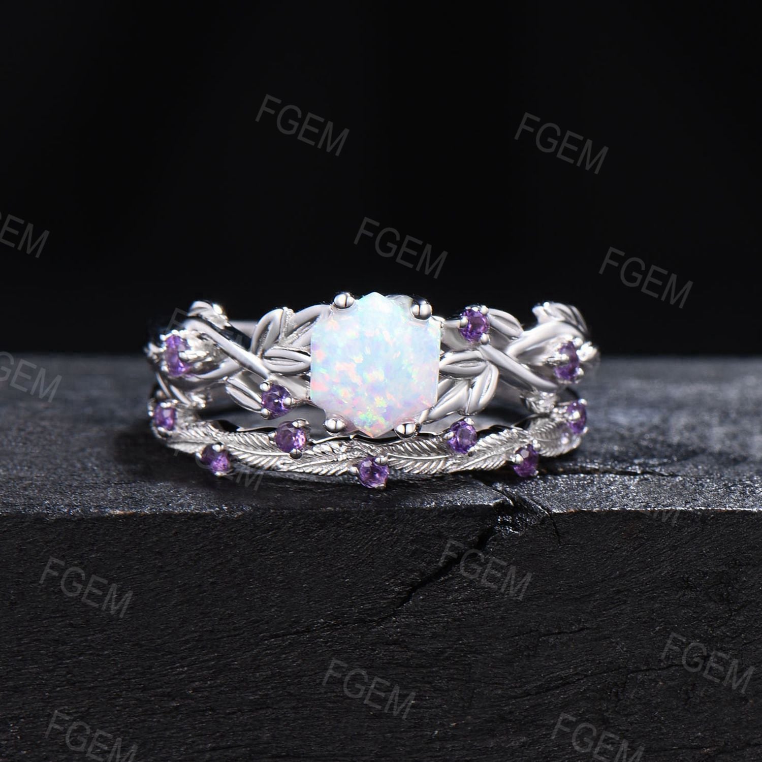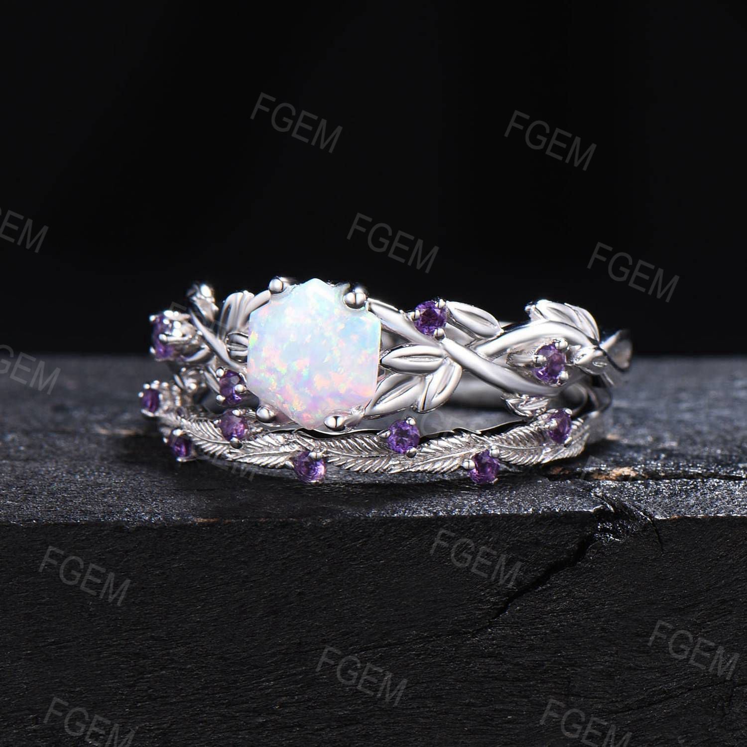 Twig Leaf Opal Engagement Ring Nature Inspired Amethyst Bridal Set Hexagon White Opal Wedding Ring October Birthstone Jewelry Proposal Gift