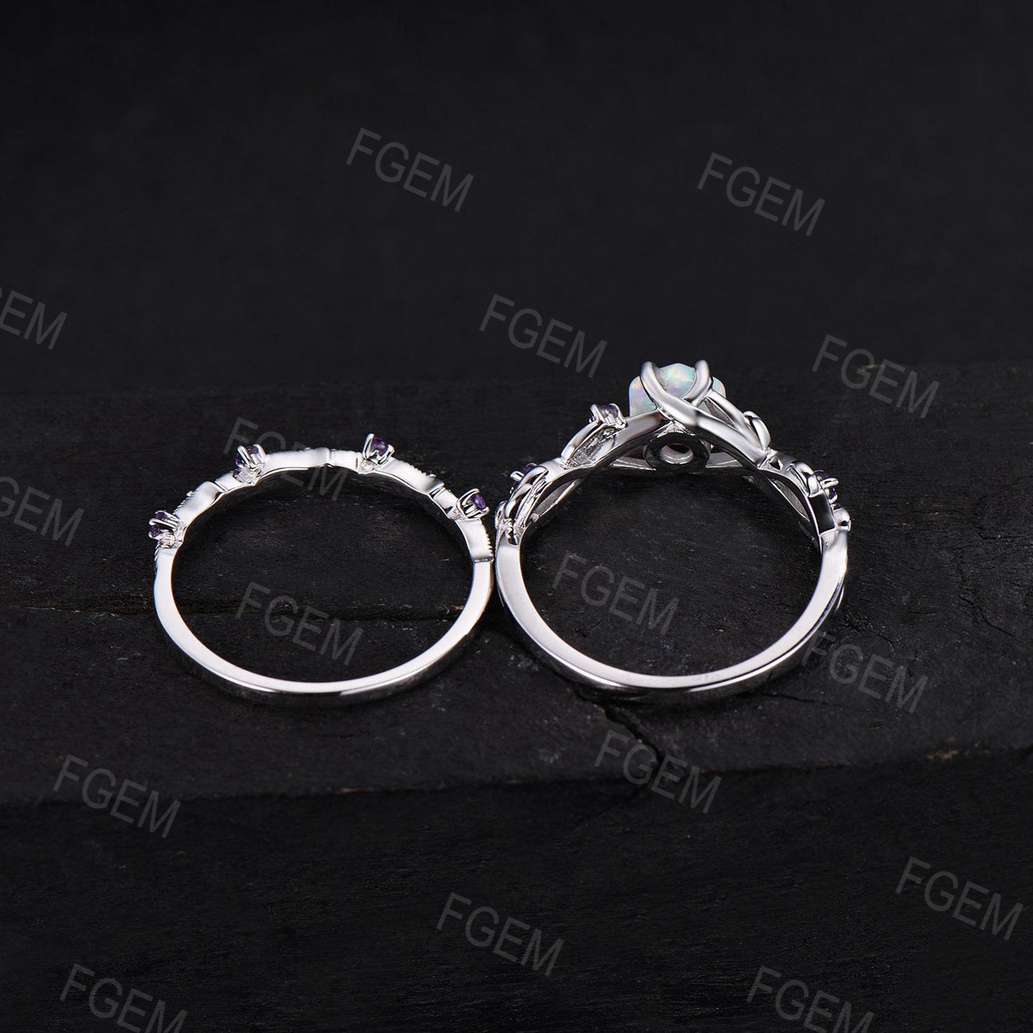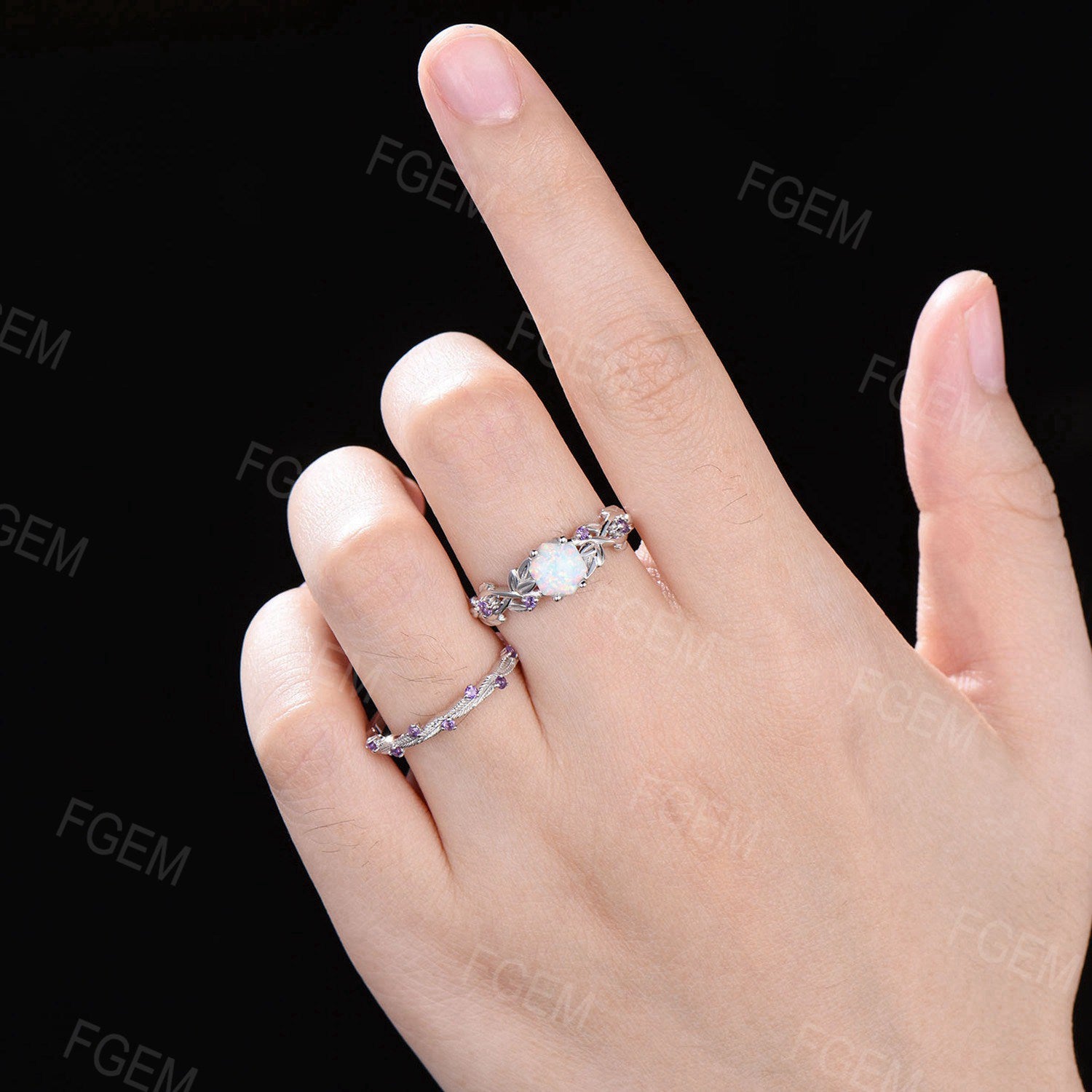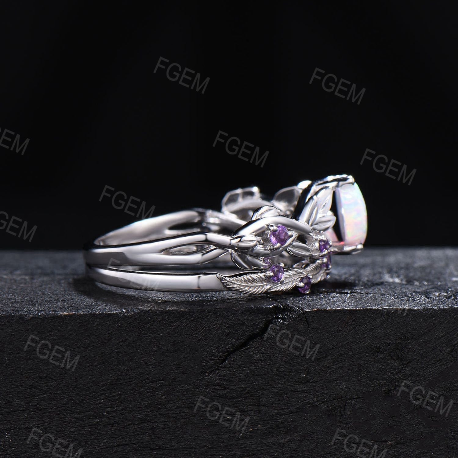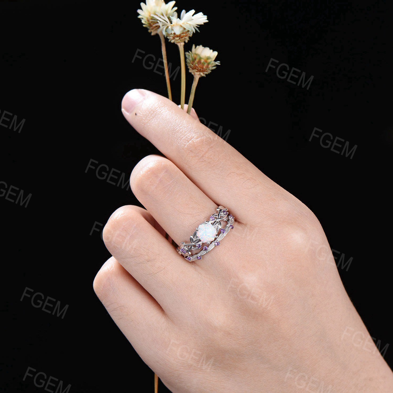 Twig Leaf Opal Engagement Ring Nature Inspired Amethyst Bridal Set Hexagon White Opal Wedding Ring October Birthstone Jewelry Proposal Gift
