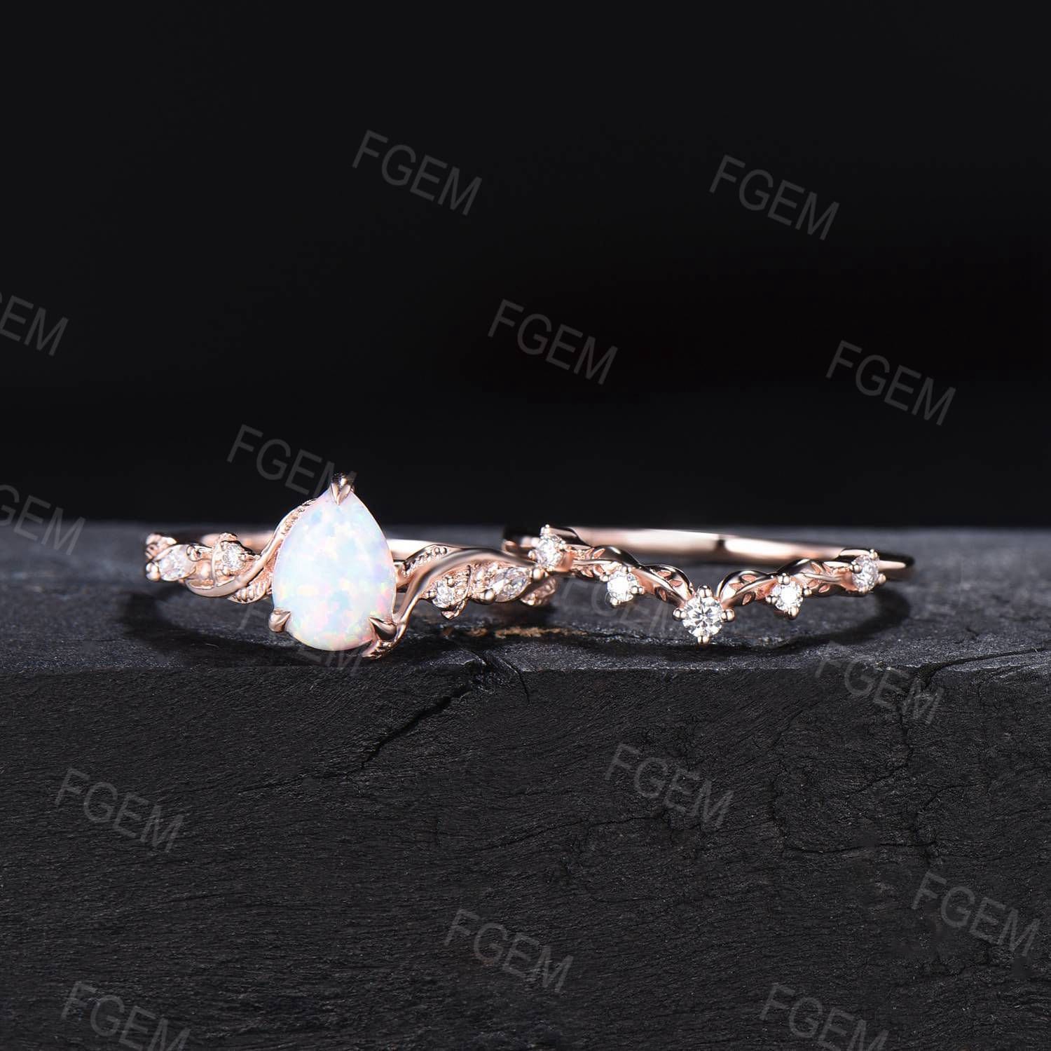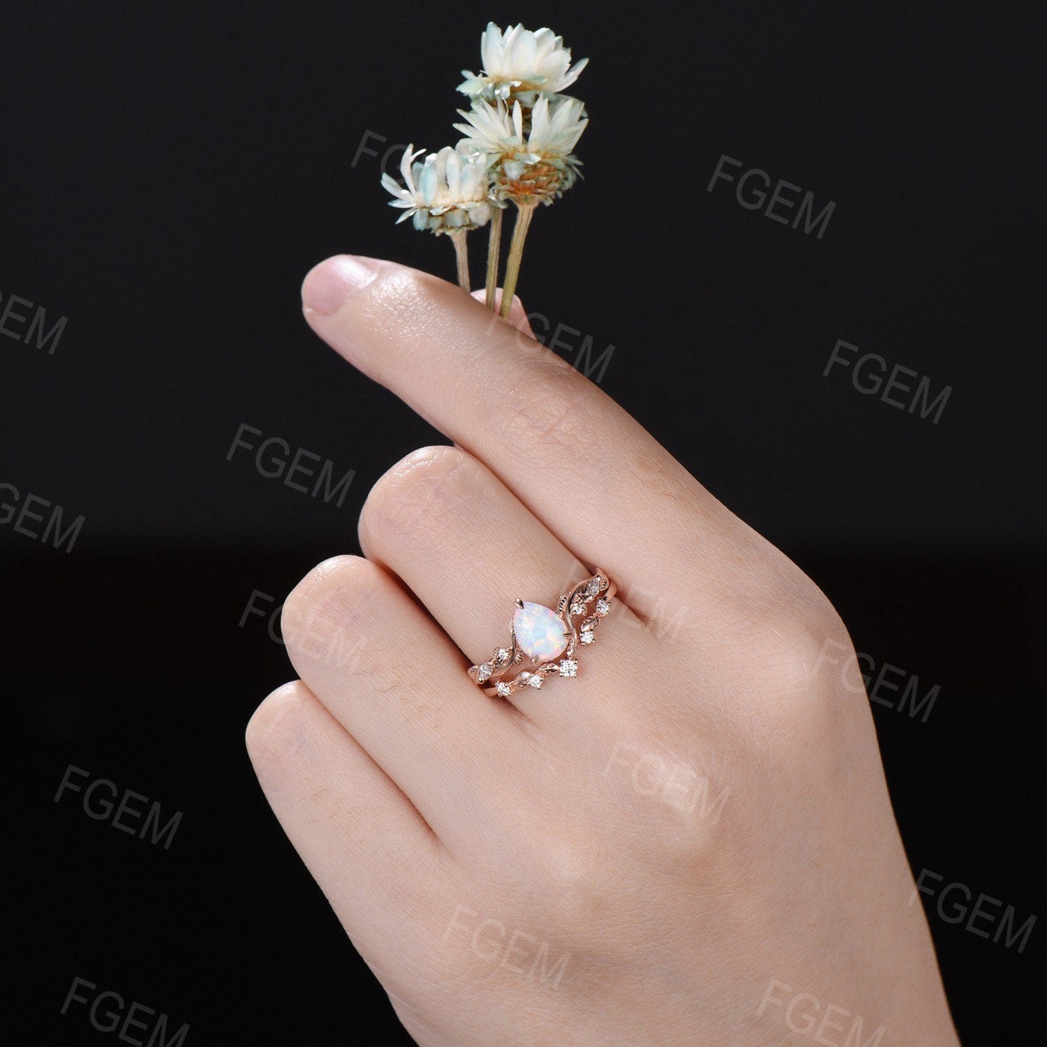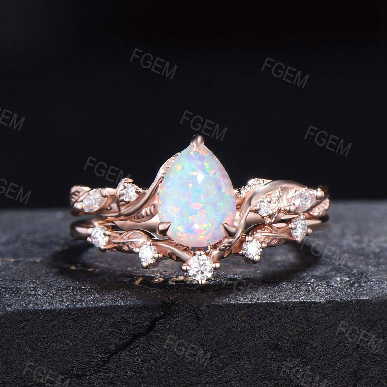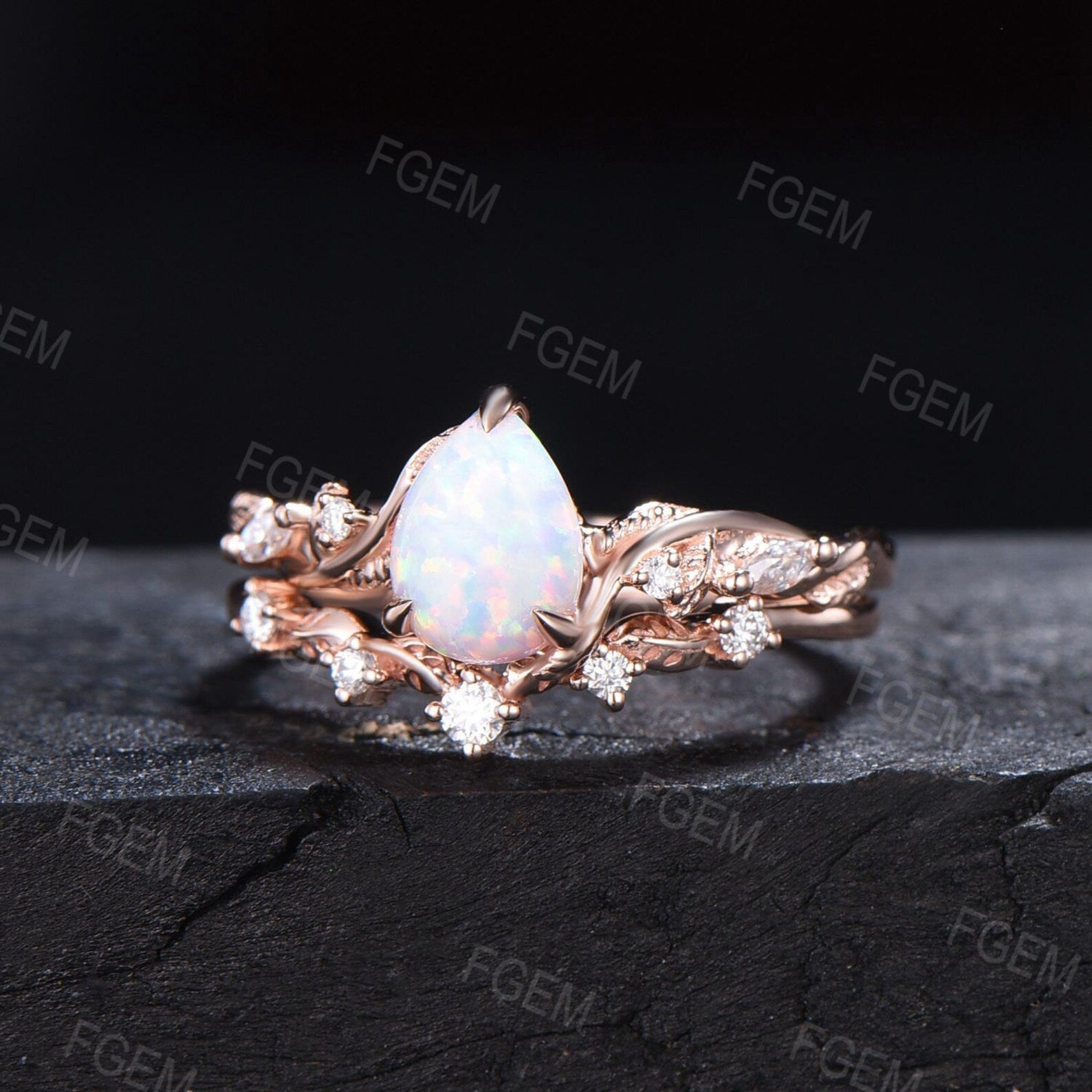 Twist Leaf Moissanite Opal Wedding Ring Set Nature Inspired White Opal Ring Set Vintage 1.25ct Pear Shaped Branch Twig Opal Engagement Ring