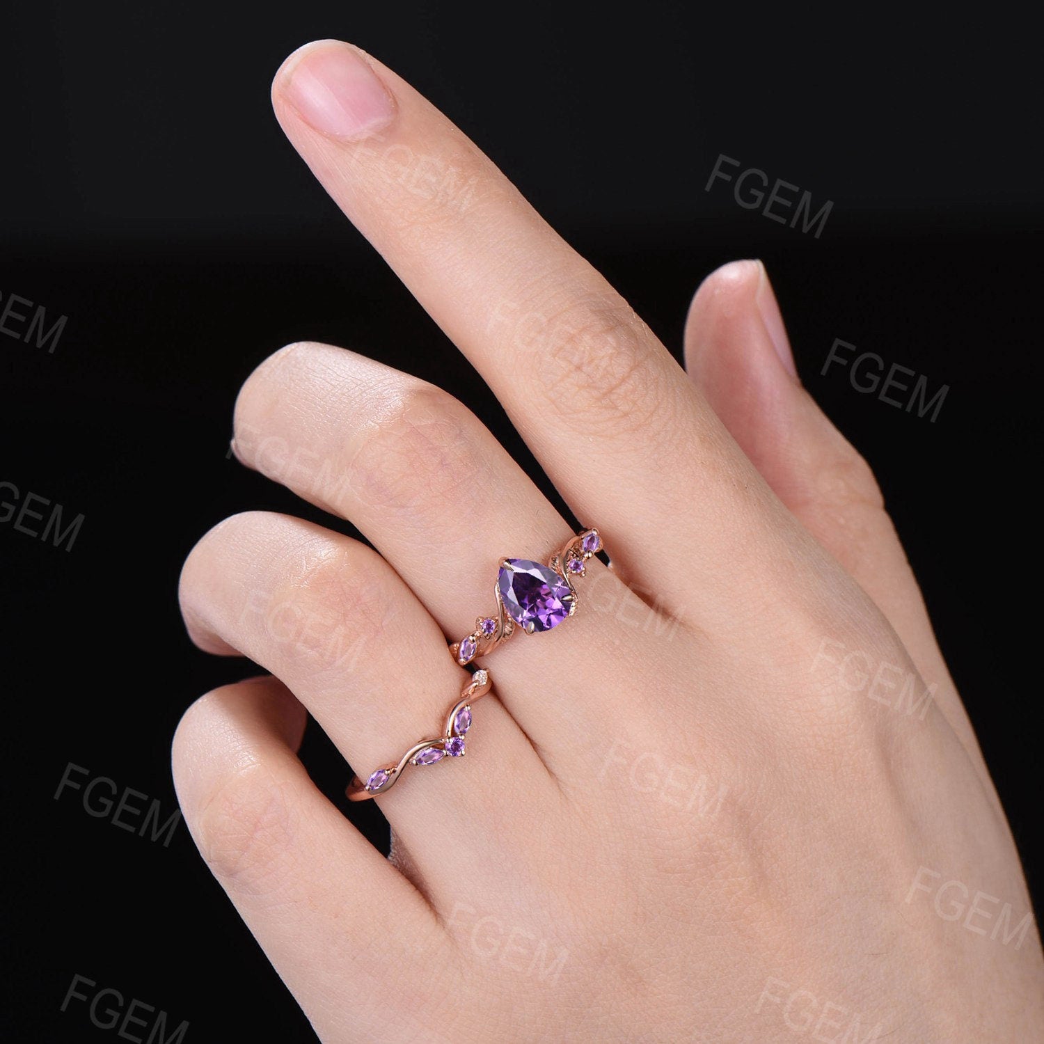 Twist Leaf Natural Amethyst Bridal Set February Birthstone 1.25ct Pear Shaped Nature Inspired Amethyst Ring Set Purple Crystal Wedding Ring