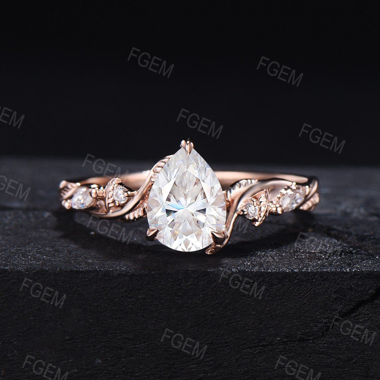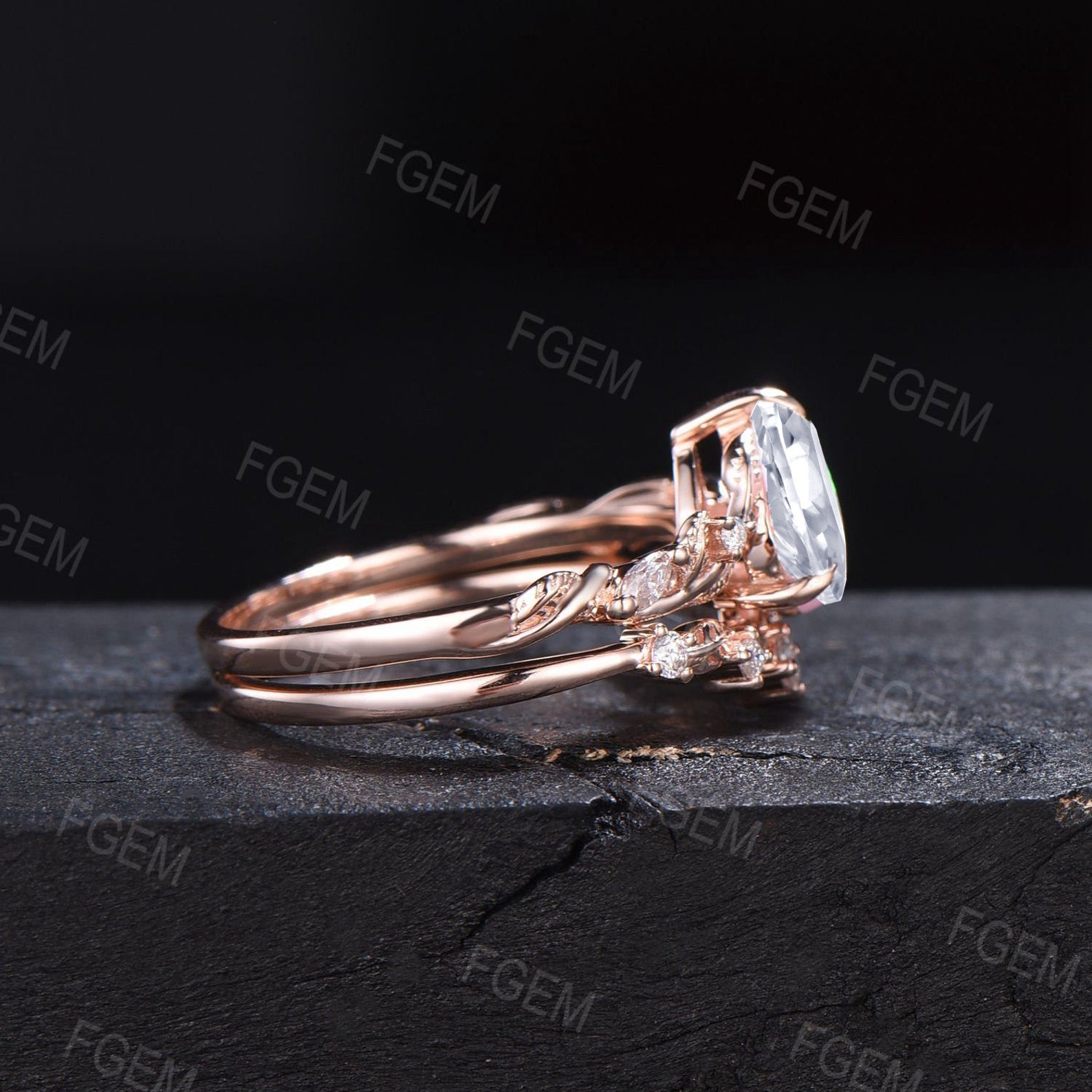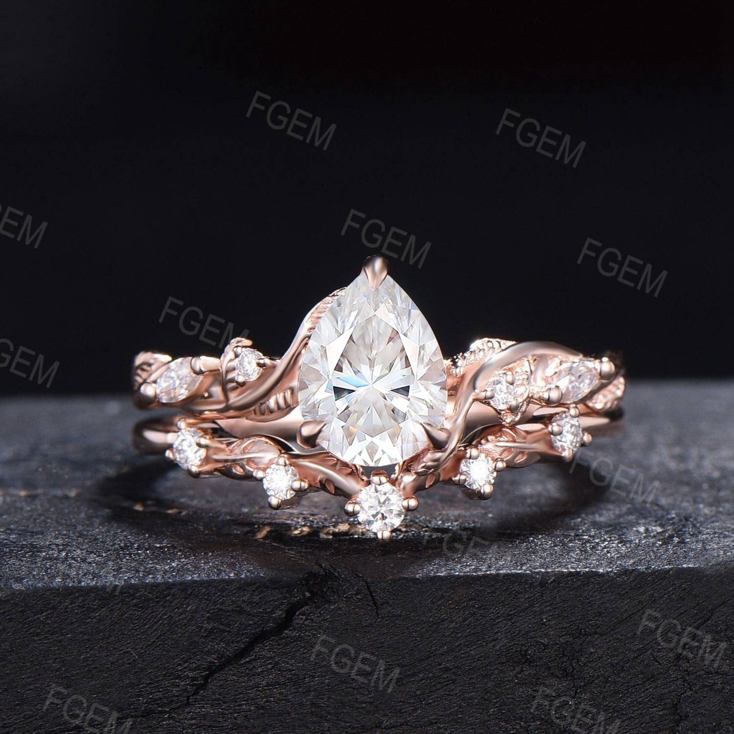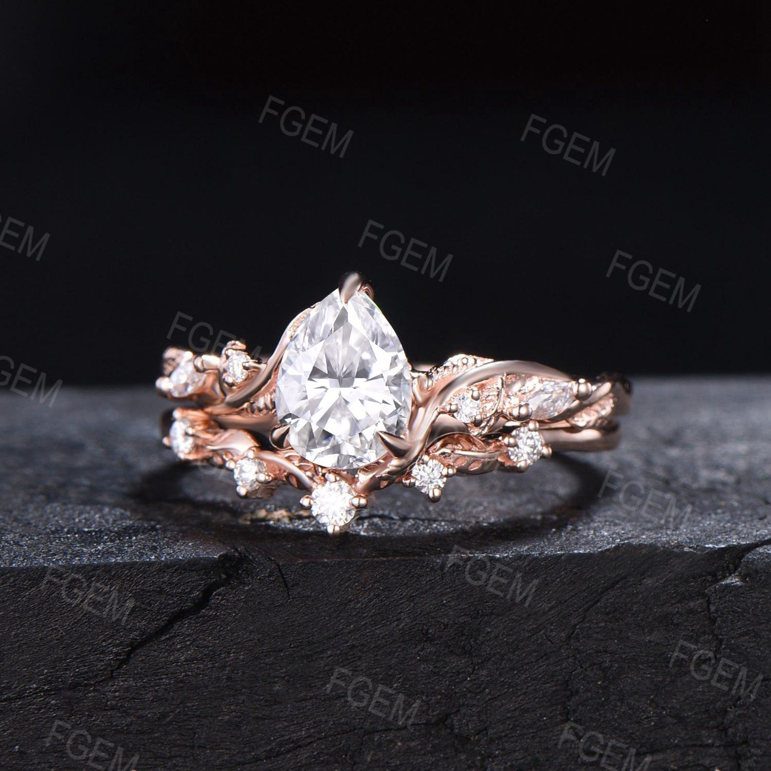 Twist Twig Nature Inspired Pear Moissanite Engagement Ring Set 14K Rose Gold Leaf Cluster Moissanite Diamond Wedding Bridal Set Promise Gift