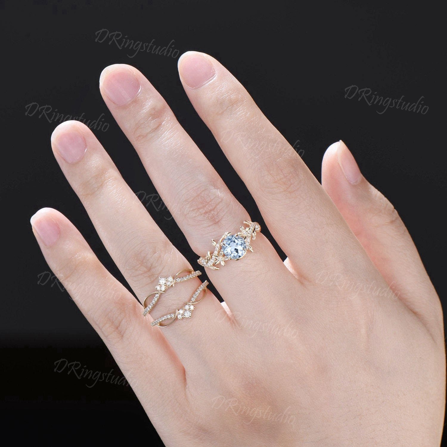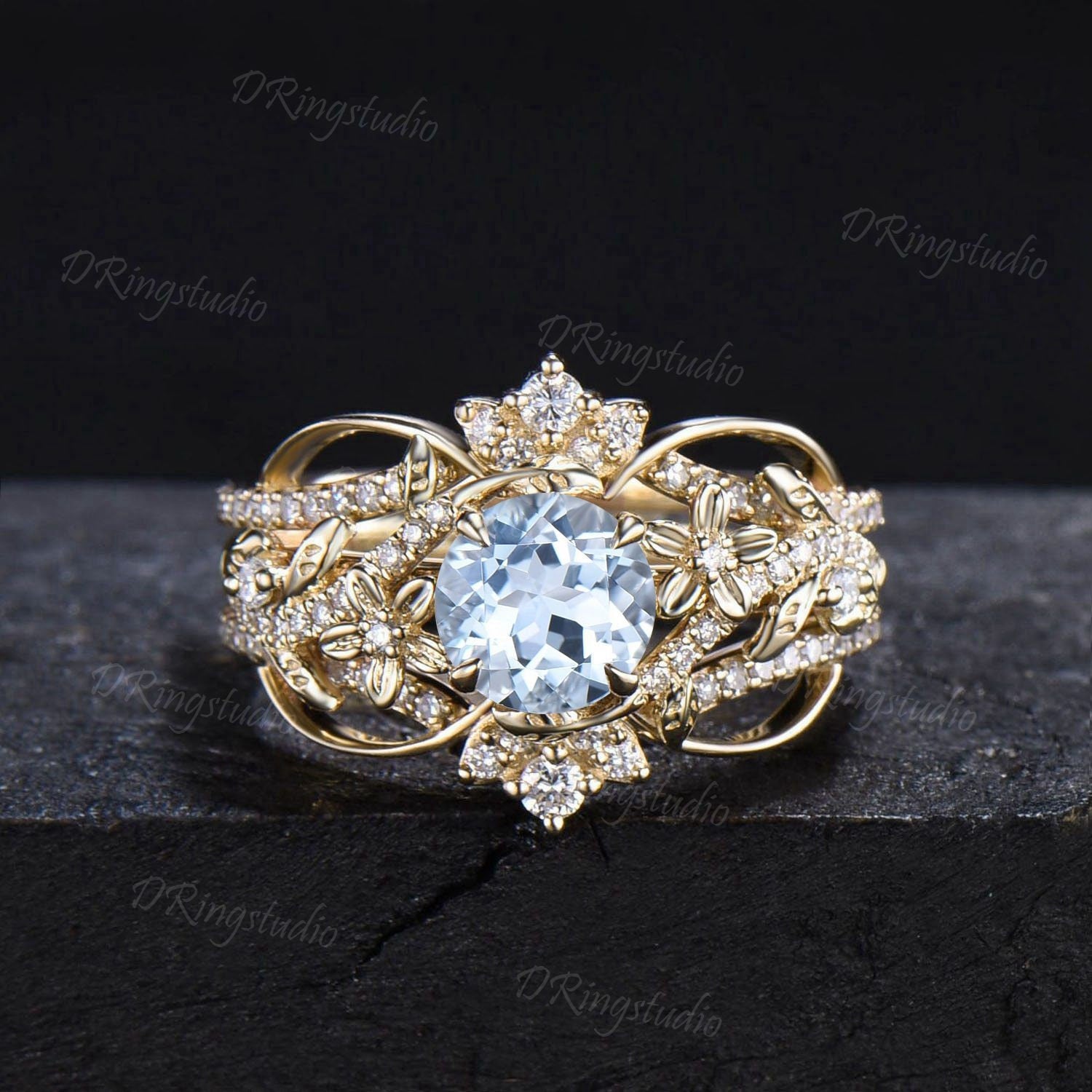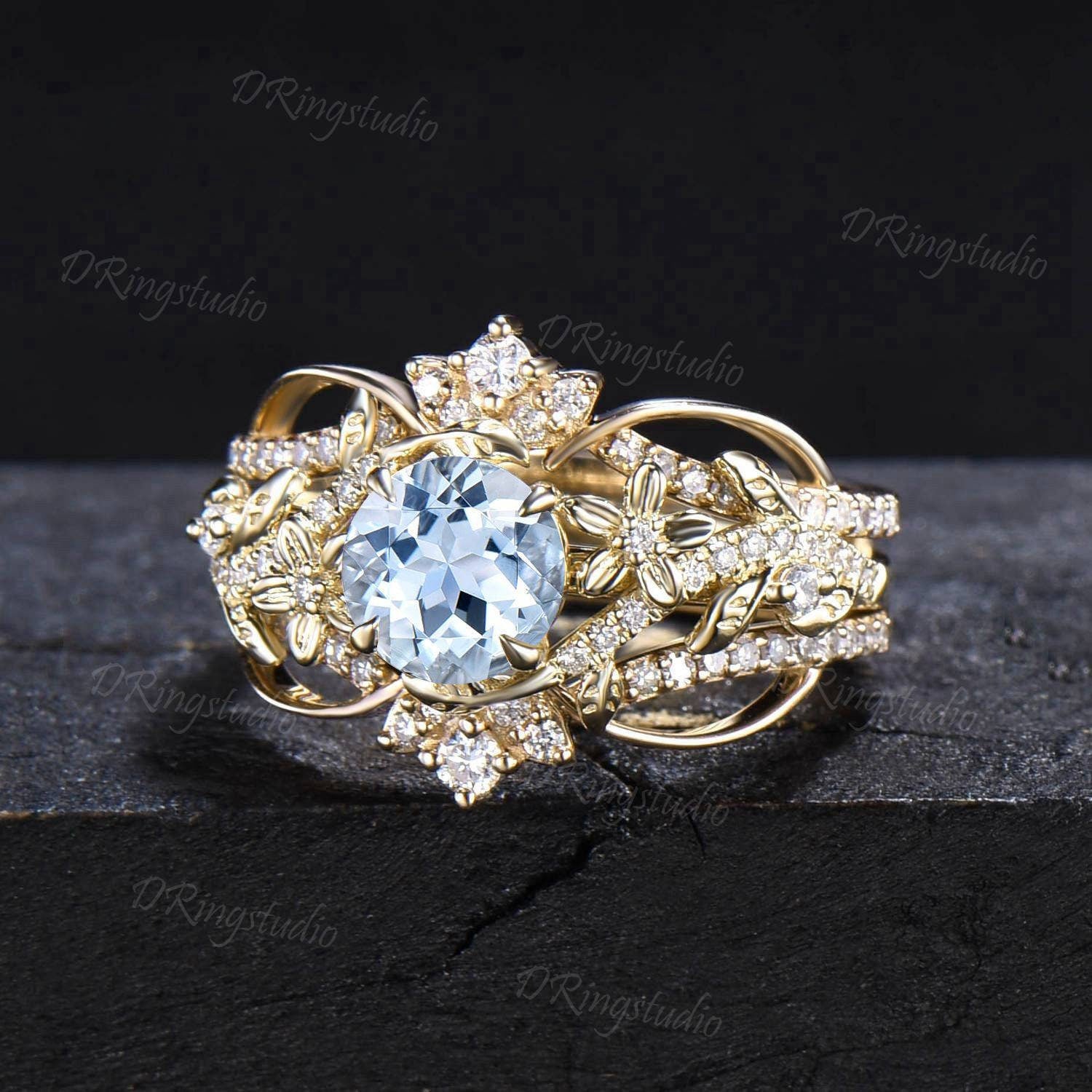 Unique Enhancer Guard Ring Set 1ct Natural Aquamarine Engagement Ring 14k Solid Gold Double Curved Diamond Matching Band Floral Wedding Ring