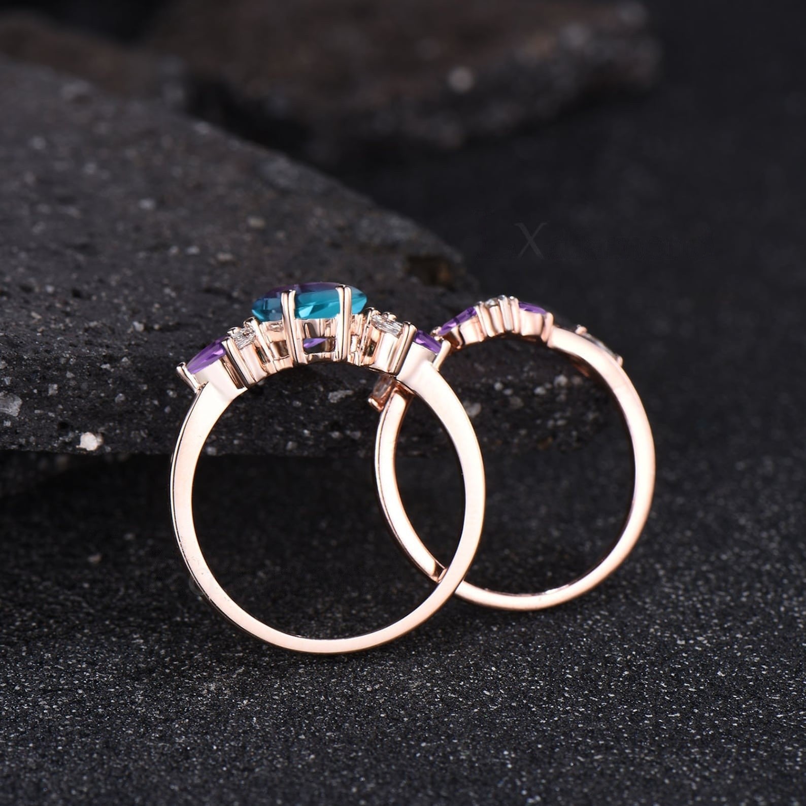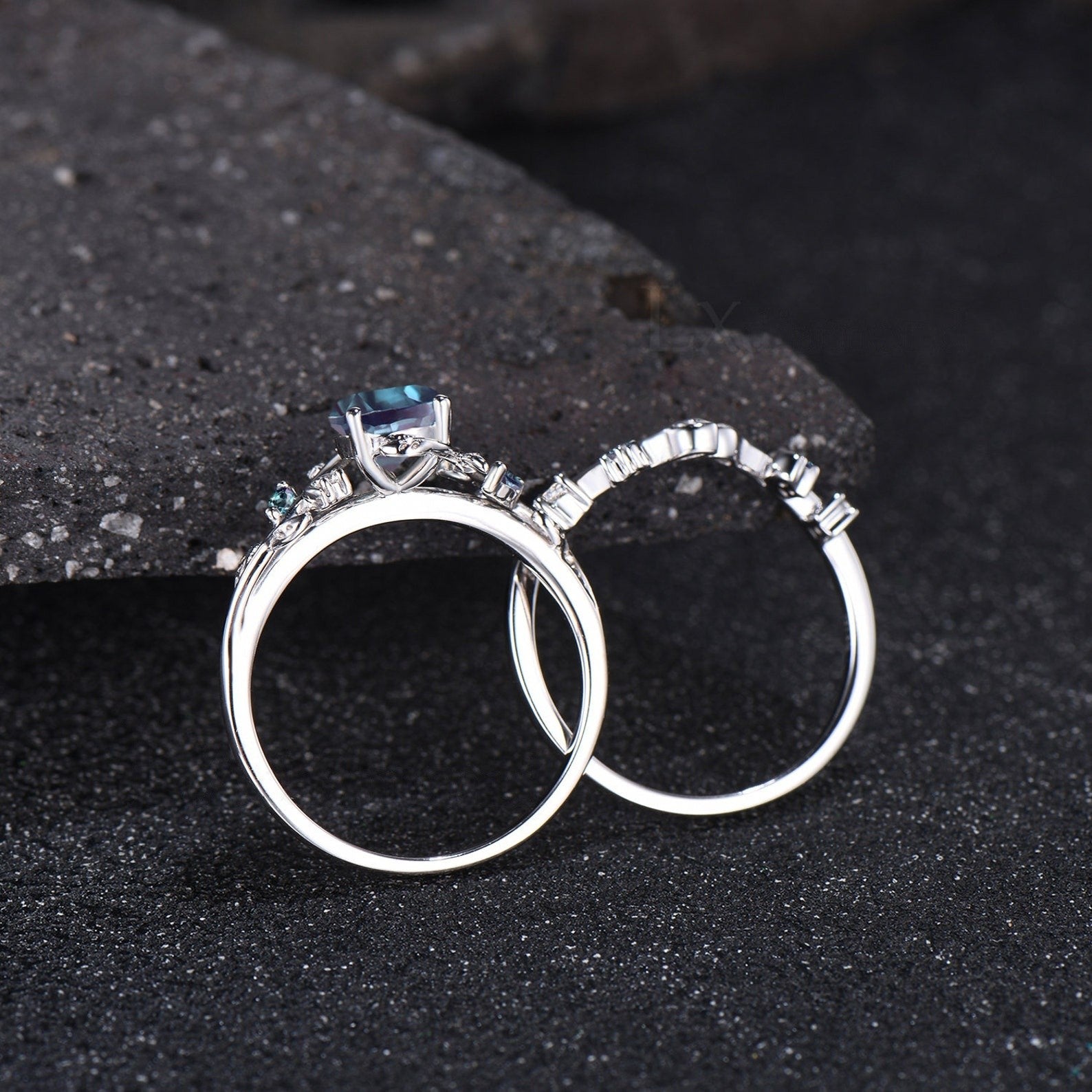 Unique Kite Cut Alexandrite Engagement Ring Set Vintage Natural Amethyst Moonstone Aquamarine Wedding Ring Art Deco 2pcs Bridal Ring Set