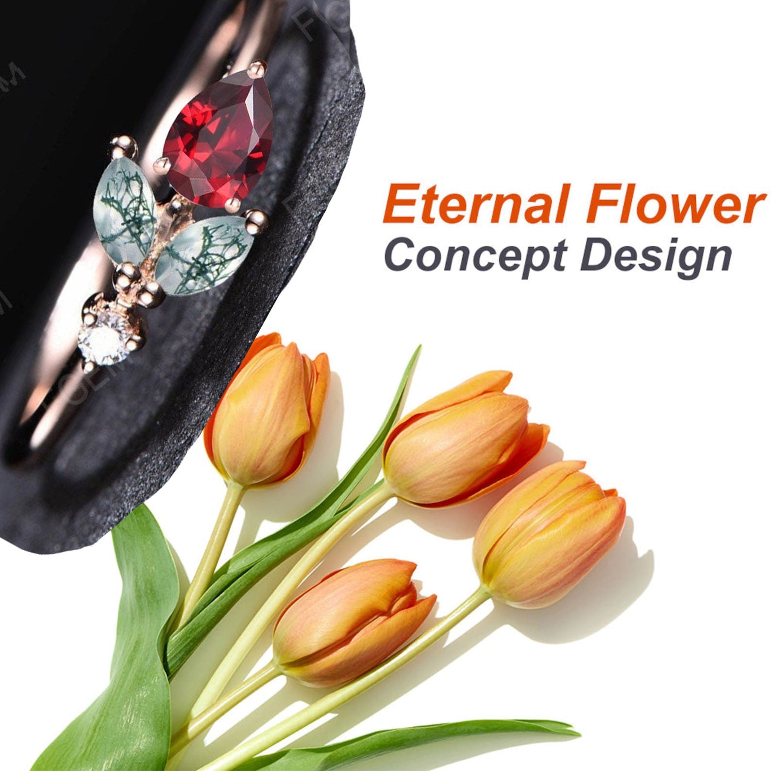 Unique Moss Agate Ruby Engagement Ring Dainty Pear Red Ruby Ring Marquise Moss Ring July Birthstone Minimalist Wedding Ring Birthday Gifts