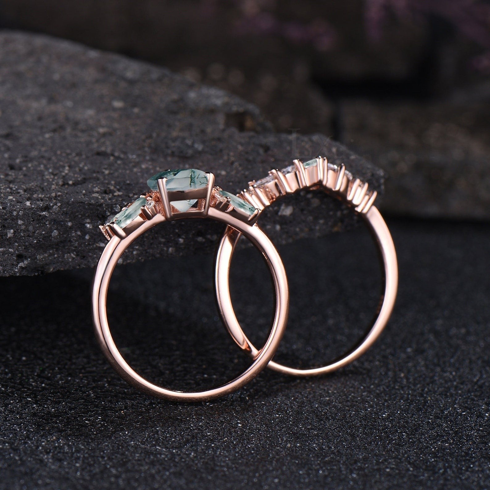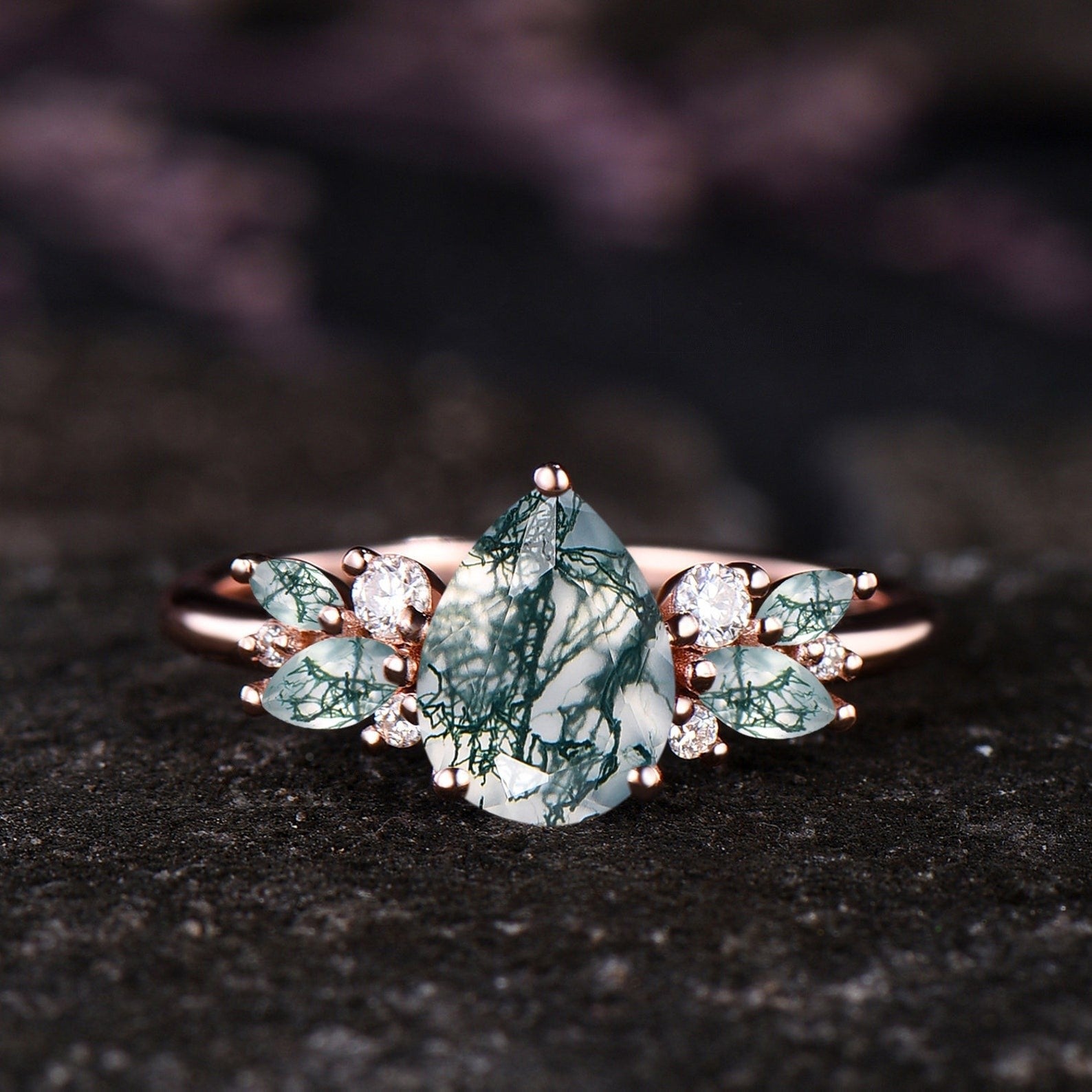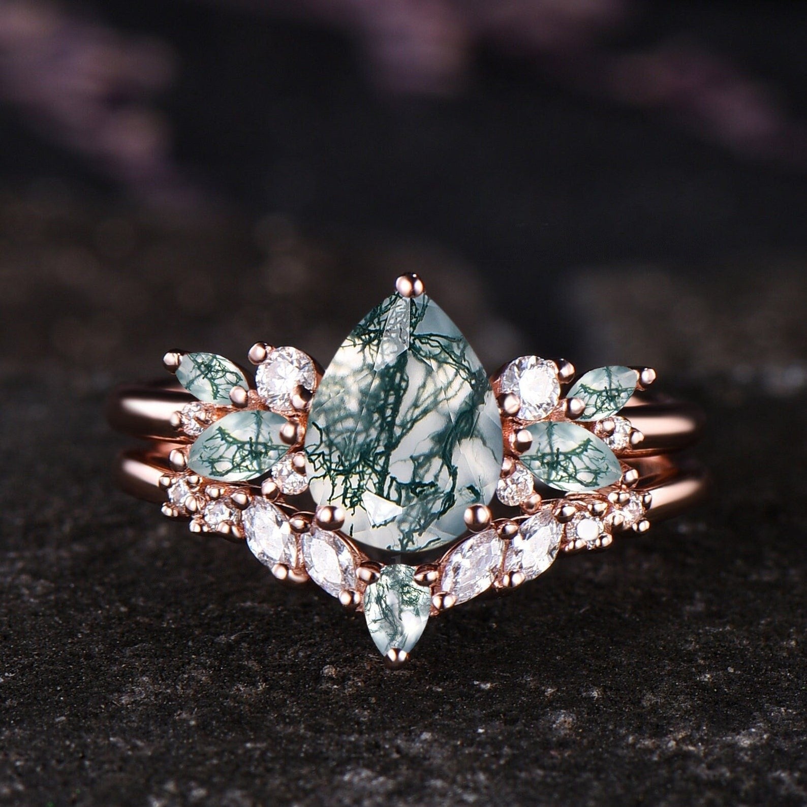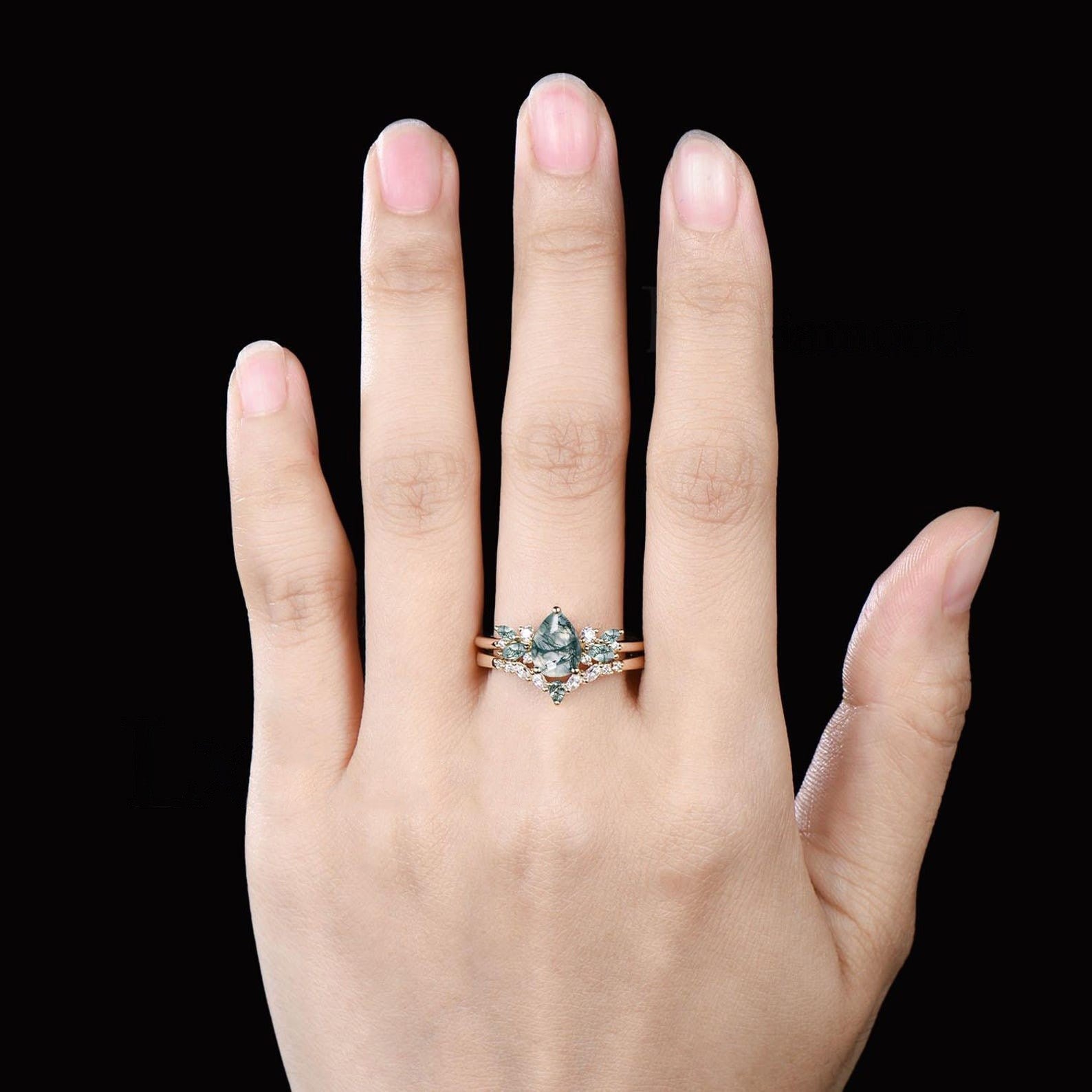 Unique Teardrop Moss Agate Engagement Ring Set Vintage Moissanite Cluster Wedding Ring 14k Rose Gold Sterling Silver 2pcs Bridal Ring Set