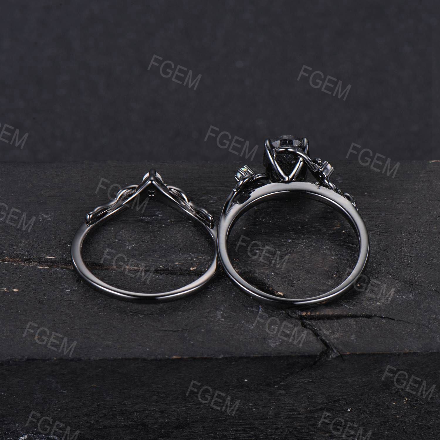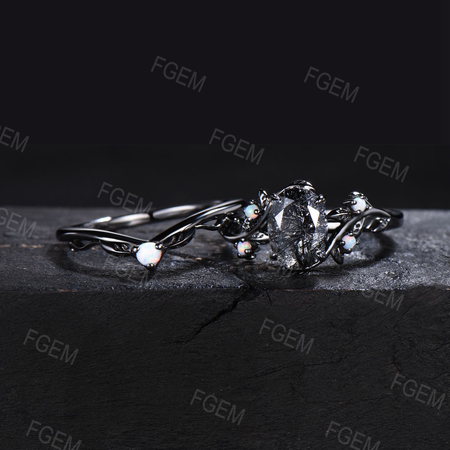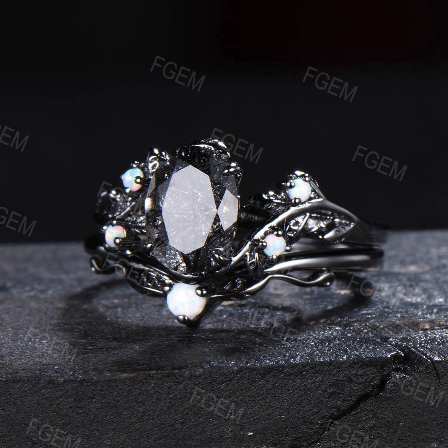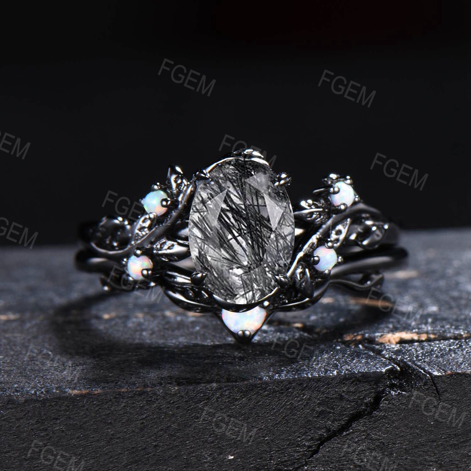 Vintage Black Rutilated Quartz Engagement Ring Oval Natural Black Gemstone Ring Black Gold White Opal Wedding Ring Anniversary Gift for Him