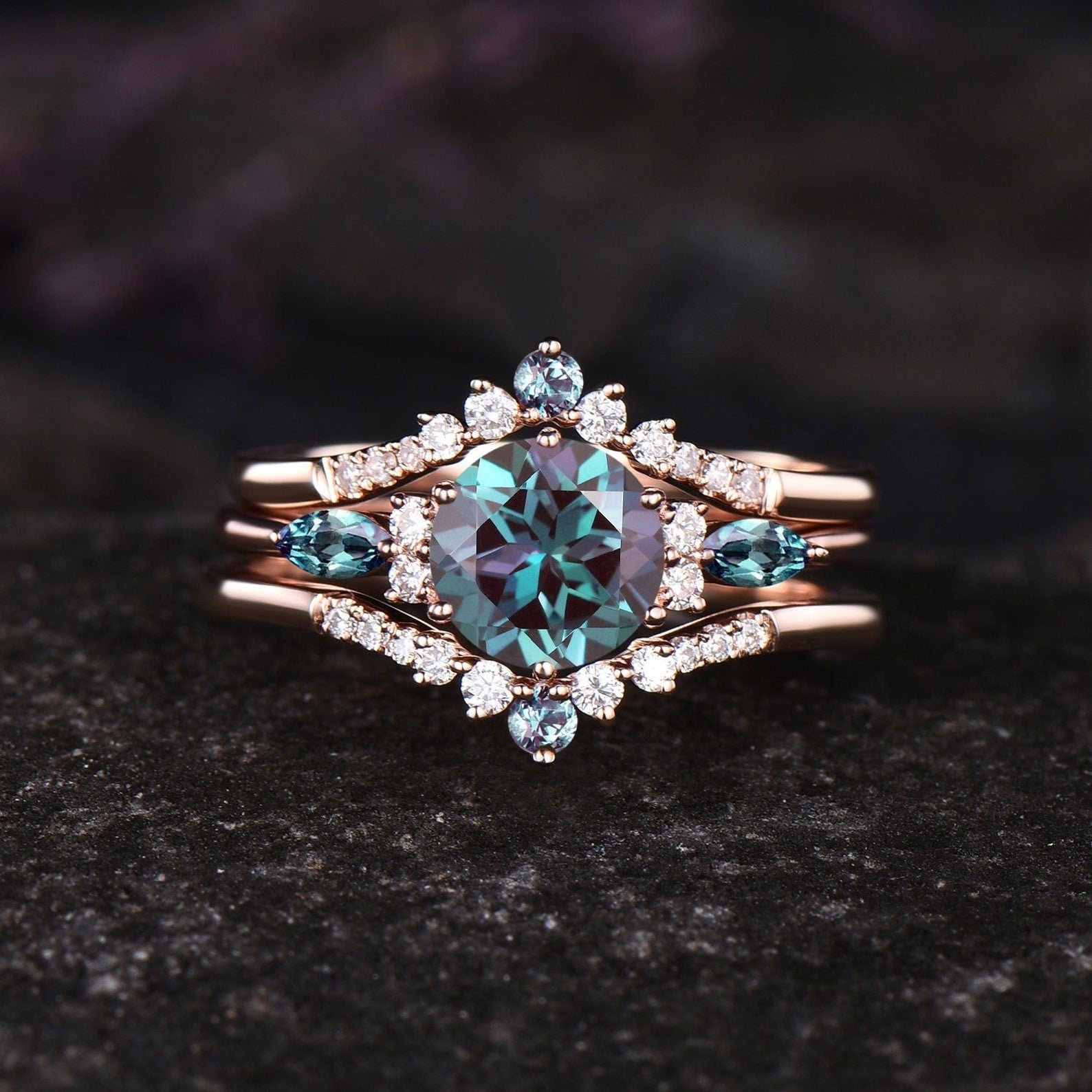 Vintage Round Alexandrite Engagement Ring Set June Birthstone Alexandrite Wedding Band 14k Rose Gold Cluster Halo 3pcs Bridal Ring Set Women