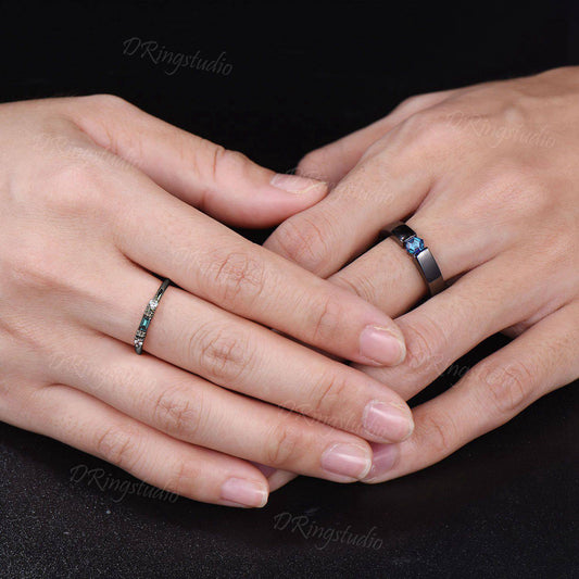 Black Gold Matching Couple Ring Set Moon Star Alexandrite Engagement Ring Matte Wedding Band His and Hers Ring Set Promise Ring for Couples